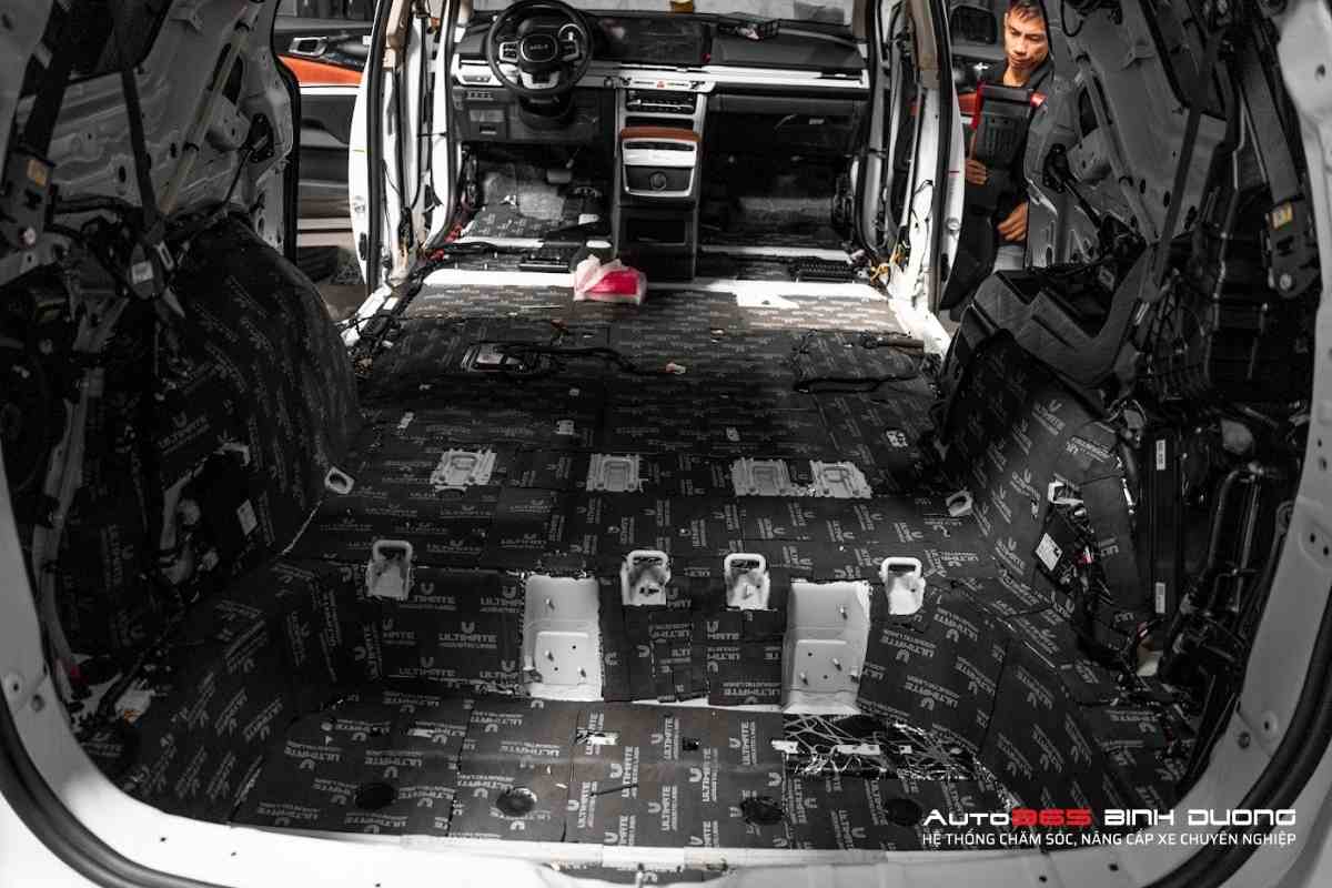 Lớp cách nhiệt sẽ được gia công dán ở phần sàn với 2 lớp cách âm tối đa. Cũng như dán ở hốc bánh và cửa xe từ 2 đến 3 lớp. Khoang máy cũng cần được dán cách âm tùy theo nhu cầu của chủ xe.